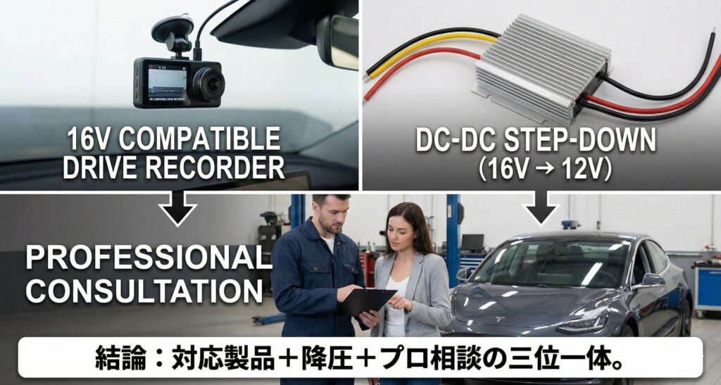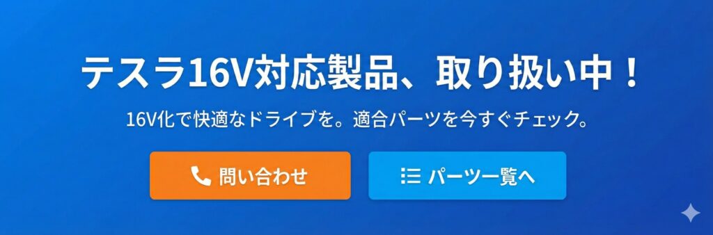 テスラは電気のログ(記録)を全て取っています。リスクを避けるためにも、16V対策はプロショップへ依頼することを強く推奨します。